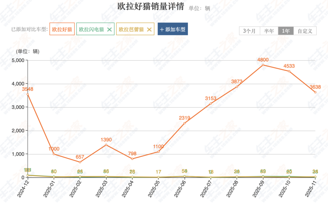 曾经占据品牌销量80%的黑猫白猫退出后,新产品未能填补市场空白。好猫虽然取得了一定成绩,但难以支撑整个品牌;芭蕾猫和闪电猫则市场反应平平,月销量长期徘徊在三位数。欧拉销量也从2021年的13.5万辆暴跌至2024年的6.33万辆,并在2025年继续下滑。