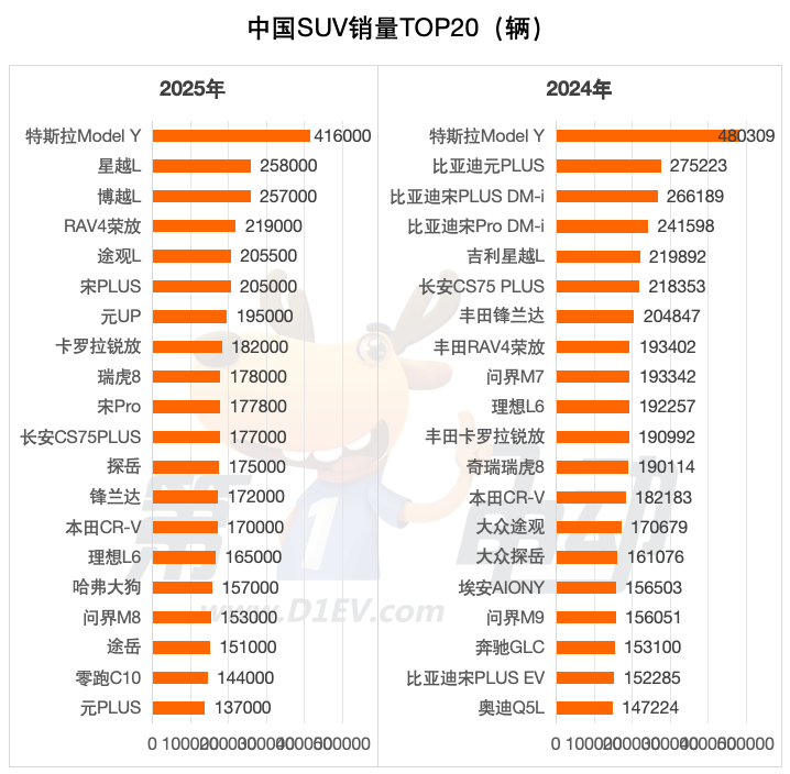 以下2025年度SUV TOP20为预估量,与明年1月中旬披露的零售量会略有出入。不当之处,请批评指正。