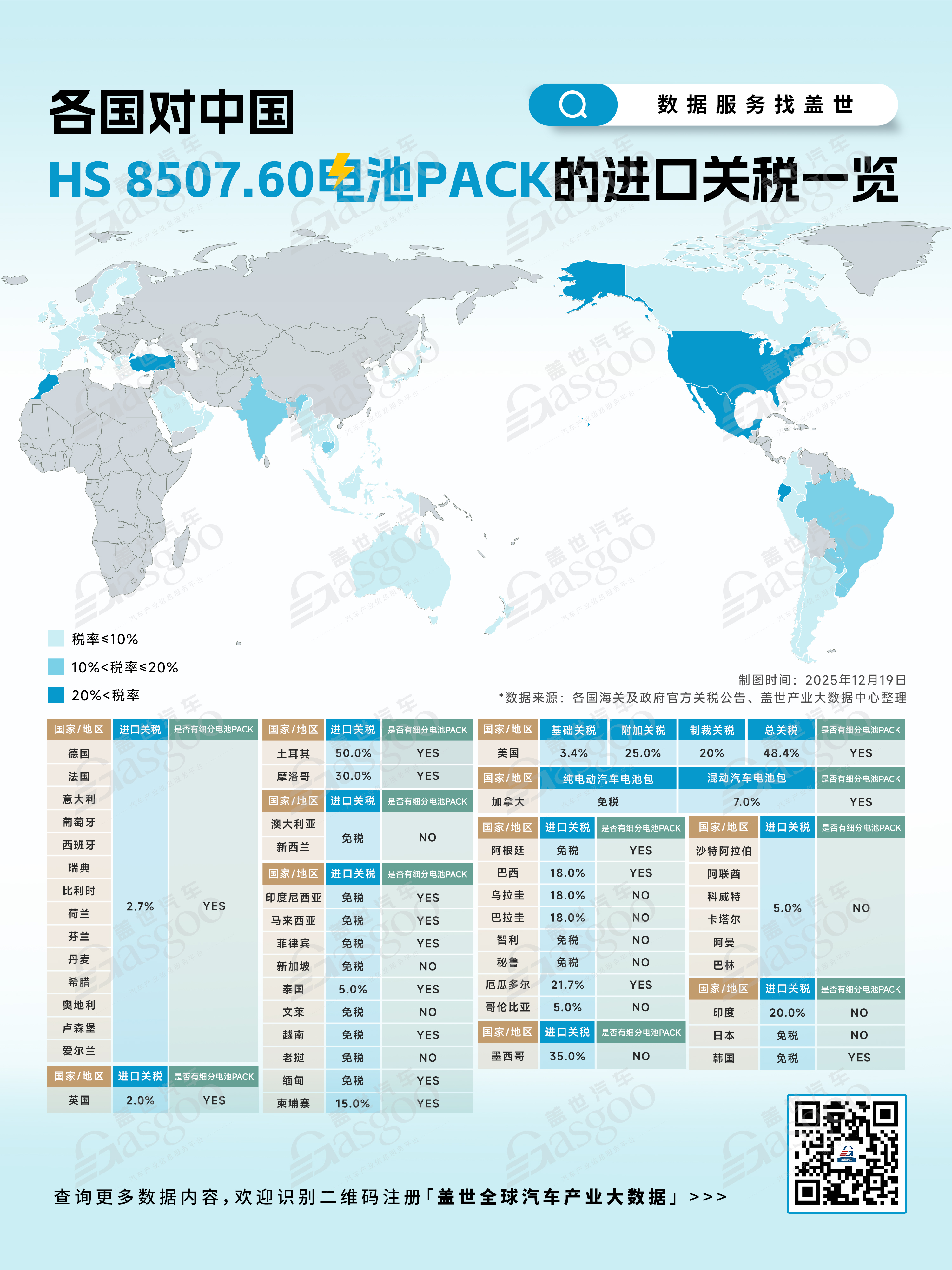 随着中国新能源汽车产业链出海提速,电池PACK作为核心部件,其进口关税已成为影响企业海外布局的核心成本变量。盖世全球汽车产业大数据平台发布的多国对华HS 8507.60电池PACK进口关税数据,清晰勾勒出全球不同市场的准入成本特征与贸易政策导向。