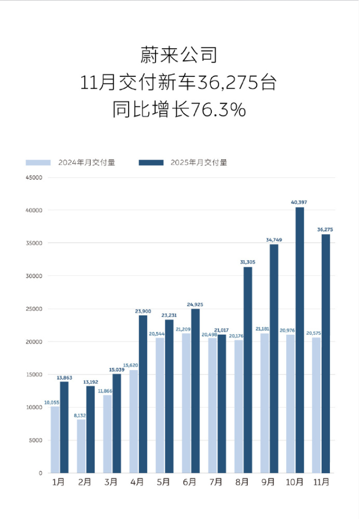 蔚来11月交付新车36,275辆,同比增长76.3%。旗下三大品牌均呈现增长:蔚来品牌交付18,393辆,乐道品牌交付11,794辆,萤火虫品牌交付6,088辆。截至11月,蔚来累计交付量达949,457辆。多品牌战略正助力其开拓更广泛的市场区间。