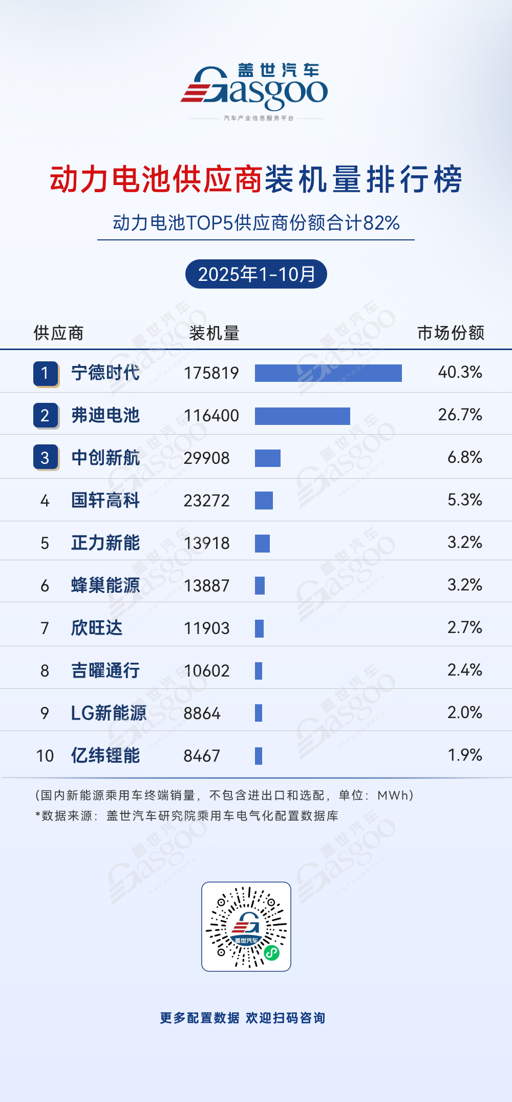 弗迪动力,2025年1-10月装机量1,337,666套,市场份额25.0%。