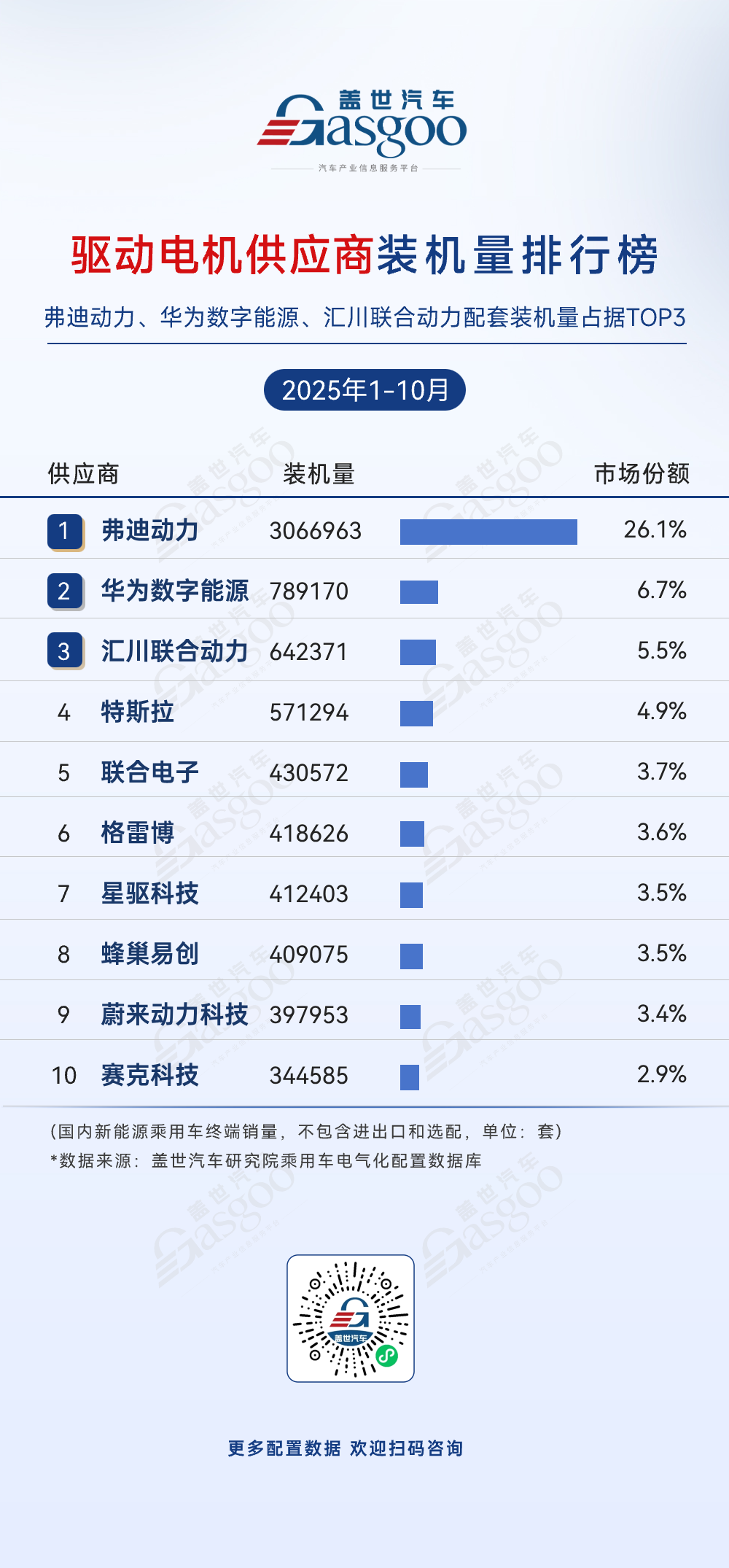 2025年1-10月驱动电机供应商的装机量格局中,弗迪动力形成绝对领跑优势,以3,066,963套的装机量及26.1%的份额独居第一,远超第二名华为数字能源(6.7%)。华为数字能源(6.7%)、汇川联合动力(5.5%)组成第二梯队,但二者份额合计仅12.2%;特斯拉、联合电子等后续主体的份额均低于5%,且差距微小。榜单中既有弗迪动力、特斯拉、蔚来动力科技等车企自研主体,也有华为数字能源、汇川联合动力等专业供应商,体现了驱动电机领域 “车企自主配套 + 对外开放供应” 的双重模式。