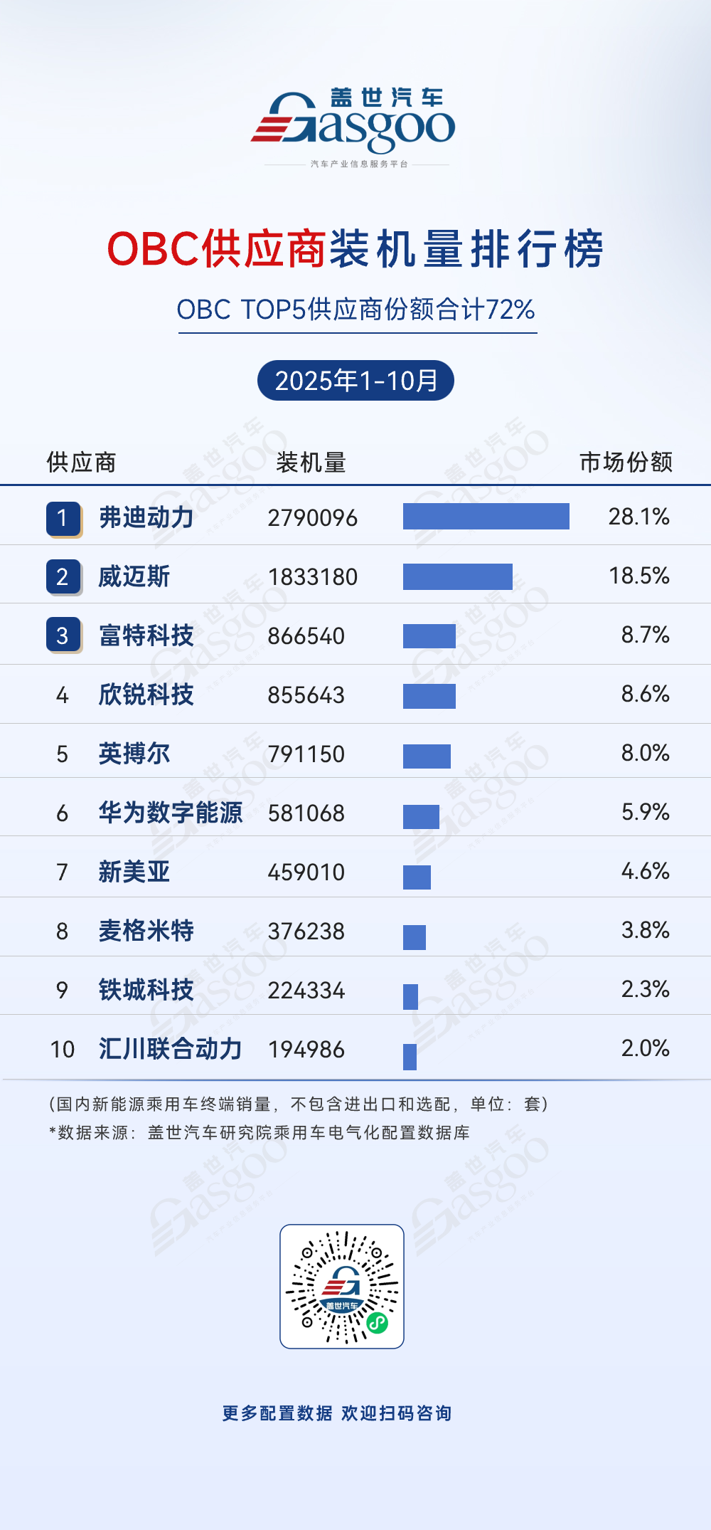 2025年1-10月OBC市场呈现 “头部双强主导、集中度高” 的特征,且TOP5供应商合计占据72%的份额:弗迪动力以2,790,096套的装机量及28.1%的份额领跑,威迈斯以18.5%的份额居次,富特科技、欣锐科技等专业供应商紧随其后,这类厂商凭借技术通用性服务多品牌客户,是OBC市场的重要补充力量。第六至第十名的份额均低于6%,且逐步递减,剩余市场被多元主体分食,中小厂商更多聚焦于特定车型或细分客户的配套。