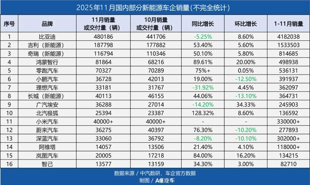 12月1日,各大新能源车企纷纷公布了最新销量数据。