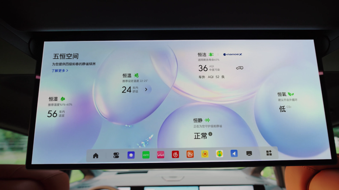 前排是一块17.2英寸的中控屏,后排则配备了一块8英寸的娱乐屏,均获得了德国莱茵低蓝光护眼认证。