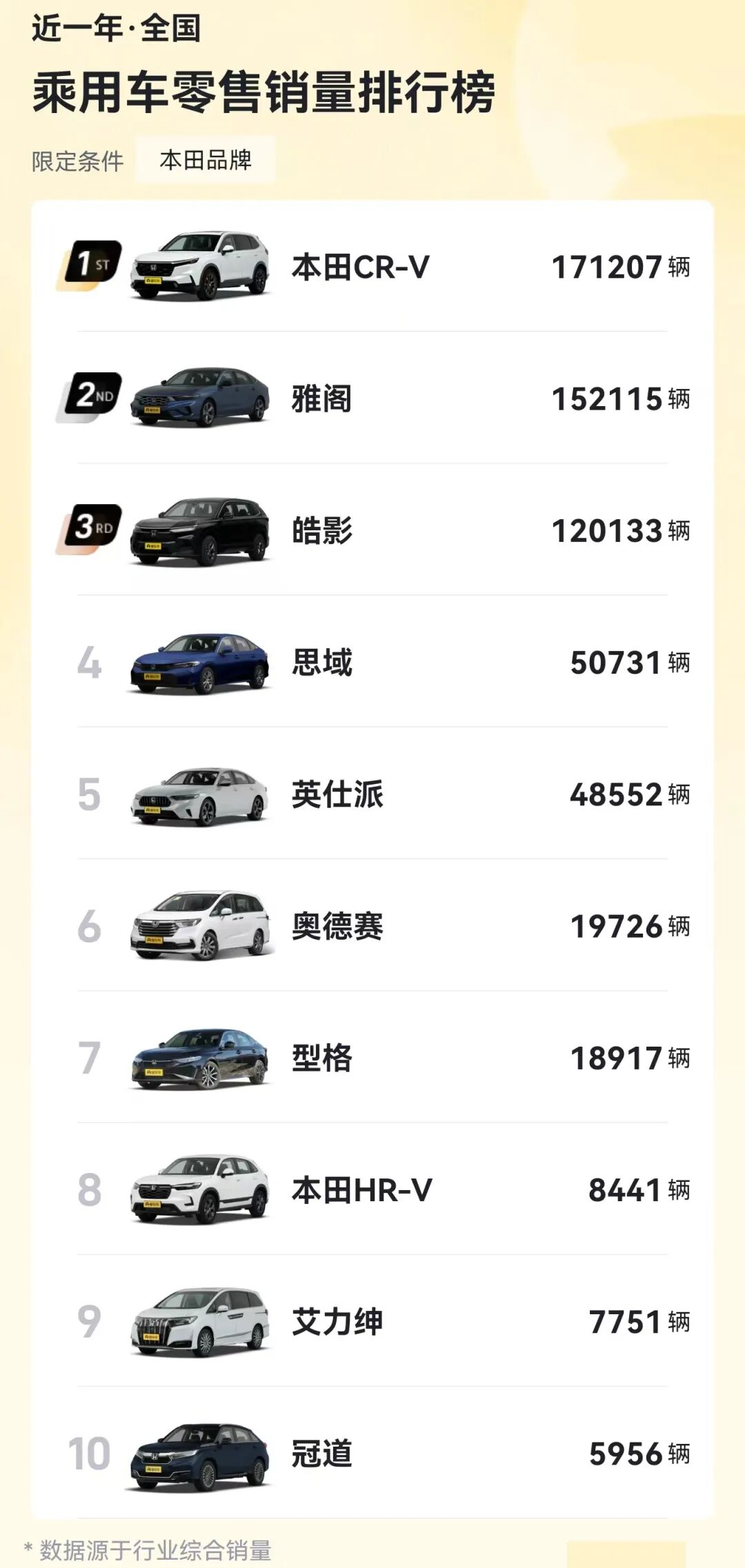 从2025年全年的零售销量数据来看,整个本田近30余款车,甚至比丰田还多两款车型,但销售销量非常低,仅CR-V(17.12万辆)、雅阁(15.21万辆)、皓影(12万辆)三款车型能打,其余主力全面沦陷。