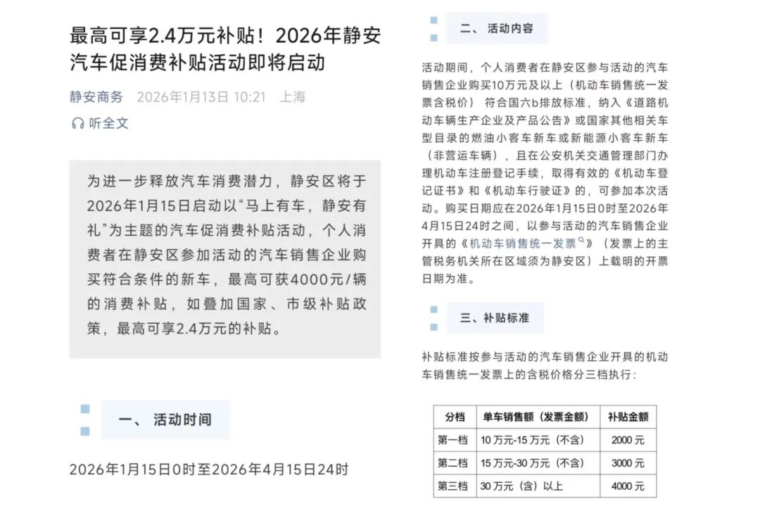 例如,山东济南近期投入5000万元专项资金,启动“万马奔腾泉城购”汽车消费补贴活动,采用“保险补贴+消费券”的组合形式直接补贴购车人群;上海市静安区将于1月15日启动“马上有车,静安有礼”汽车促消费活动,最高可获得4000元/辆的消费补贴,如叠加国家、市级补贴政策,最高可享受2.4万元的补贴。