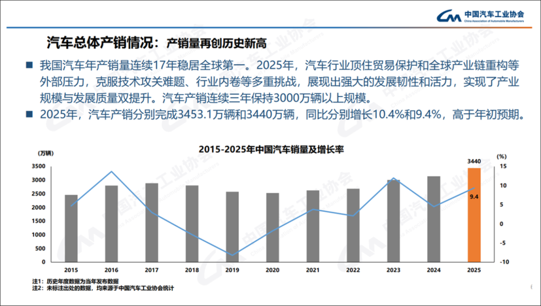 2025年,根据中汽协的数据显示,我国汽车产销再创历史新高,分别达到3453.1万辆和3440万辆,同比分别增长10.4%和9.4%,连续17年稳居全球第一。