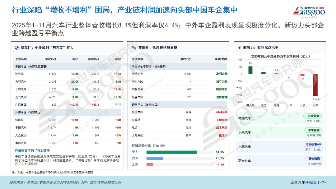 不过,需要直面的是,车市繁荣的表象之下,深层次的挑战与结构性矛盾也日益凸显。盖世汽车研究院分析了当前行业面临的共性问题,市场整体陷入增收不增利的困局,整体利润率一直在低位徘徊;国内市场的竞争已经从增量共享彻底转向存量博弈,内卷加剧;与此同时,全球贸易保护主义壁垒快速升高,车企出海也将短期承压。