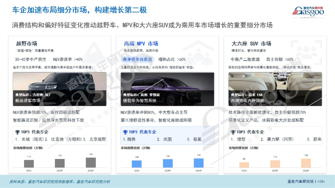 此外值得一提的是,当普及性需求被充分满足,个性化的表达与特定场景的极致满足,也已经成为新的增长源泉。盖世汽车研究院分析指出,在结构性机遇的影响下,中国乘用车市场正从一个庞大的统一市场,裂变为无数个深度细分的价值深井。