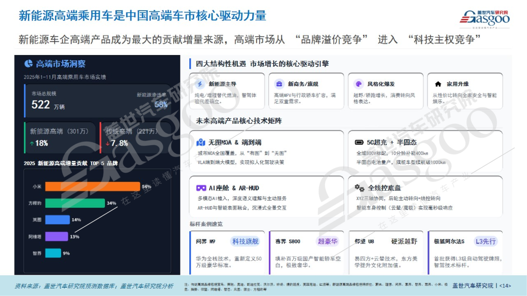 新能源高端化潜力巨大,价格带上升到30万元以上,新能源的渗透率已达58%(2025年前11个月数据),成为当前国内车市绝对的增量主力。而且更关键的是,当前的新能源高端之争,已超越传统豪华品牌的“logo溢价”,进入以尖端科技定义豪华的科技主权竞争阶段。