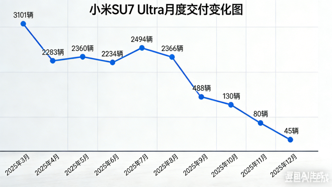 目前看来,有且仅有一个原因,小米SU7 Ultra的销量属实养不起专属销售团队,其2025年12月总销量仅为45台,相较于上市时的开售10分钟大定突破6900台,可谓云泥之别。
