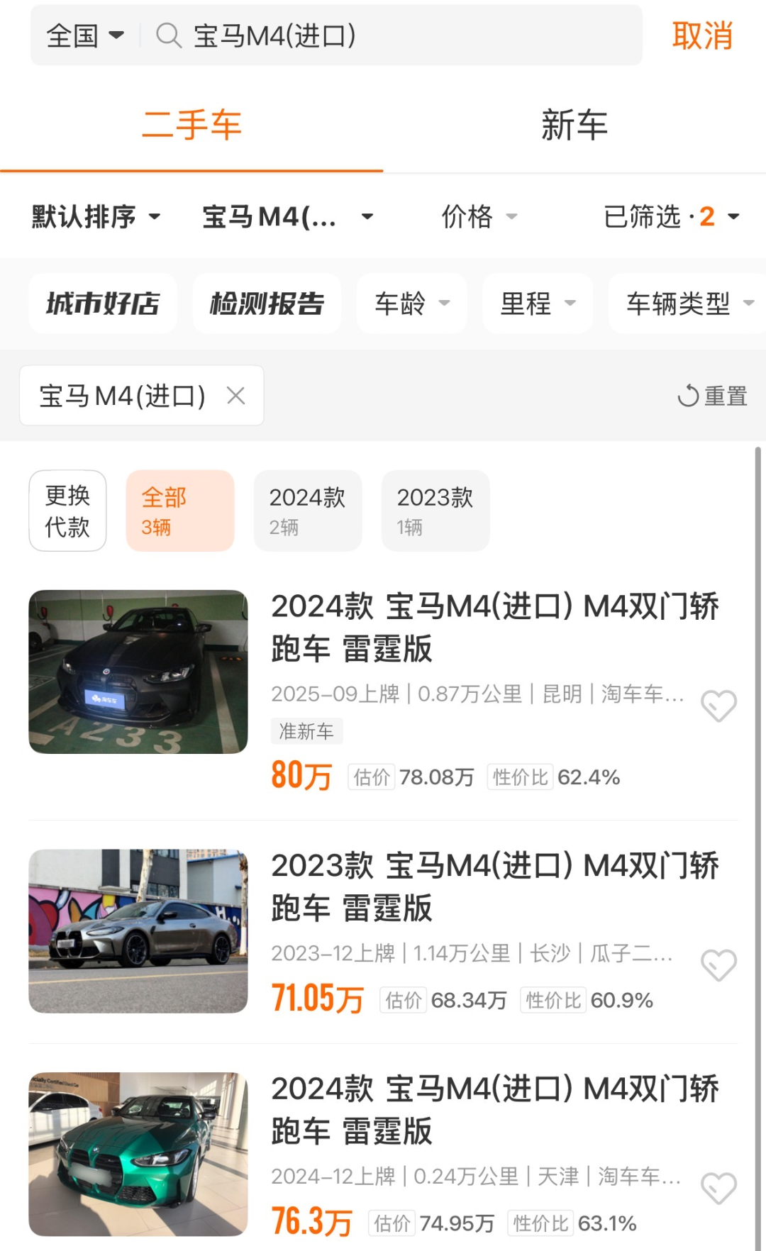 作为对比,同样以一年车龄的宝马M3\M4等高性能产品为例,即便筛查范围调整至全国,车源也有且仅有那么几台,多数选择它们的用户都愿意选择长期持有。