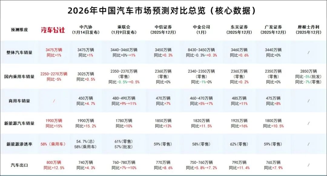 国内机构的预测一如既往地相对乐观。乘联会预测2026年预计国内乘用车零售销量约2400万辆、同比+1%;新能源乘用车零售量约1460万辆增13%、渗透率61%。中国汽车工业协会(中汽协)于1月14日发布预测:今年汽车总销量预计3475万辆,同比微增1%,其中乘用车(含出口)3025万辆,同比微增0.5%。