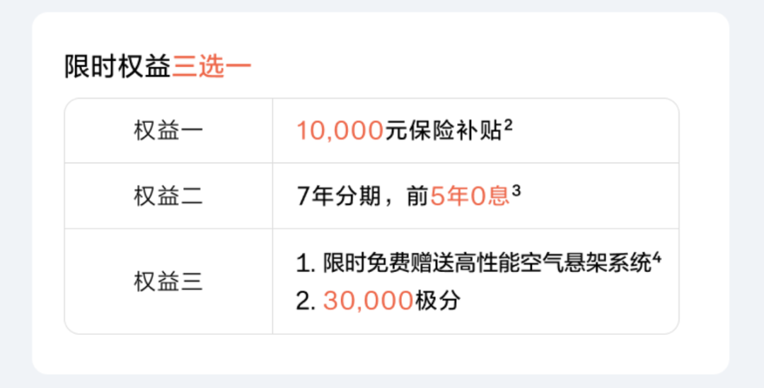 可选7年分期,前5年0息,或1万元保险补贴,或免费选装高性能空气悬架系统以及3万积分。