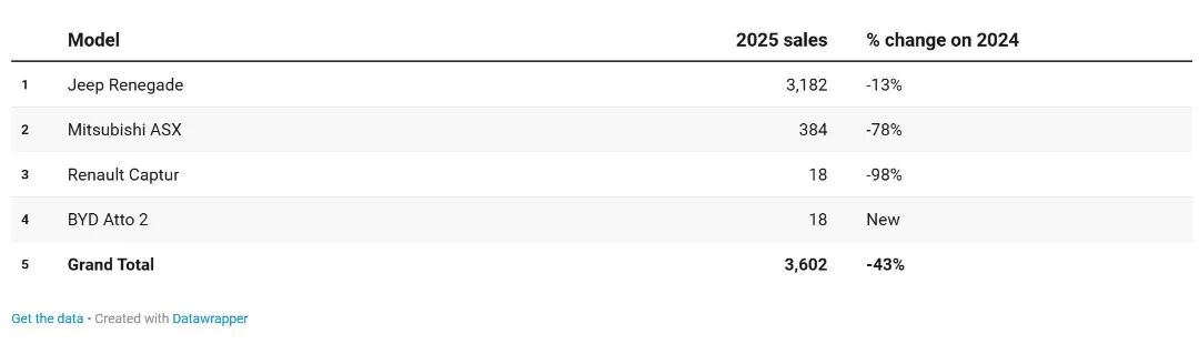 更具策略意义的是小型SUV市场。Dataforce数据显示,去年小型SUV细分市场总销量超过224万辆,但插混车型仅占3,602辆,占比0.16%。Jeep自由侠PHEV和雷诺Captur PHEV相继停产后,这一细分市场几乎成了空白。