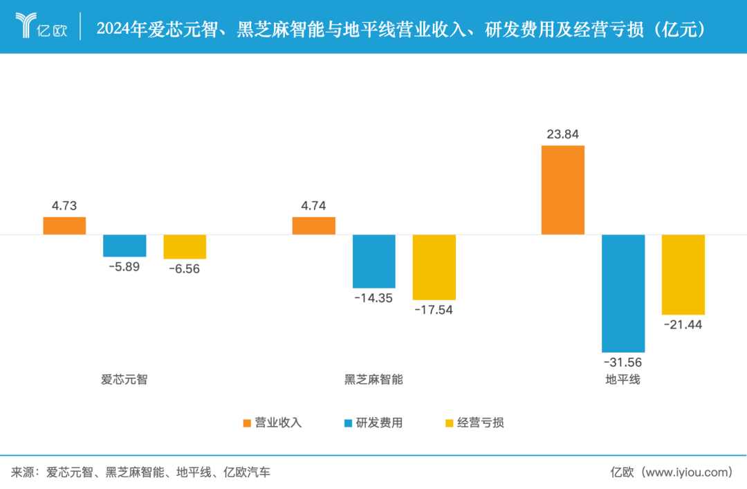 2024年两家公司的营收都在4.7亿元左右,是地平线的两成。这也对应在了二级市场的估值上,地平线总市值已超过1317亿港元,爱芯元智约189.5亿港元,黑芝麻智能则为124.1亿港元。