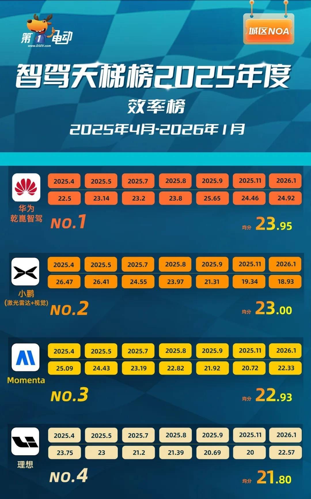同样的,2025年度华为智驾的效率得分,也画出了一条稳定上升的曲线,尽管没有安全曲线的斜率高,但仍明显优于其他同行。年度总得分23.95分(满分30分),2026年1月逼近25分。