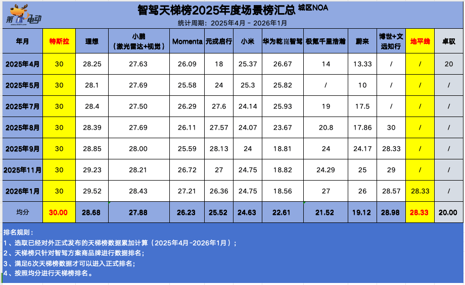 场景维度的比拼中,特斯拉以满分30分的亮眼表现展现出顶尖的场景泛化能力,毫无悬念摘得2025年度场景榜总冠军;理想凭借28.68的平均分斩获亚军,小鹏(激光雷达版本)则以27.88分位列季军。