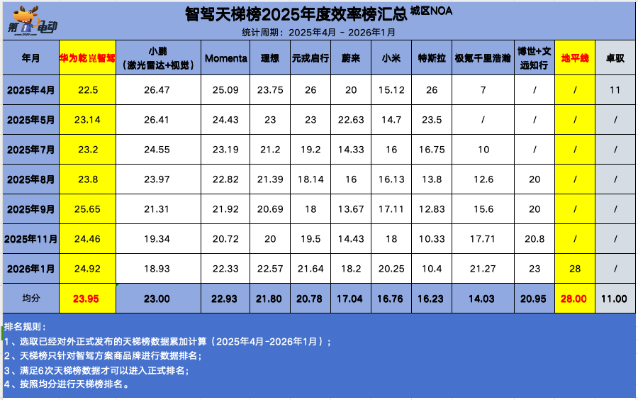 智驾天梯榜2025年度效率榜中,华为乾坤智驾以23.95分拿到效率榜榜首,小鹏以23分位居第二,Momenta平均得分22.93分,位居第三。