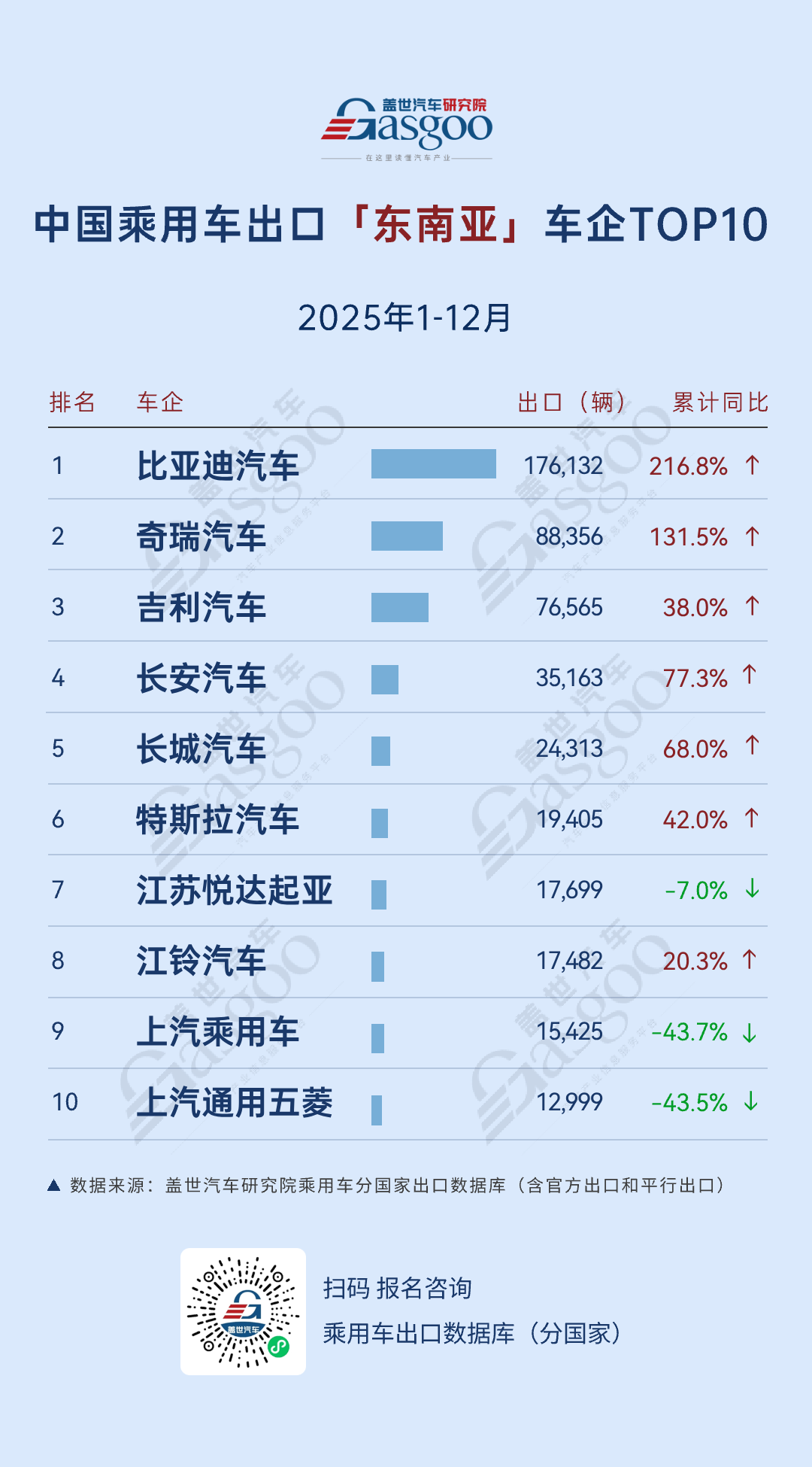 NO.1 比亚迪汽车。1-12月,向东南亚出口176,132辆,累计同比增加216.8%。