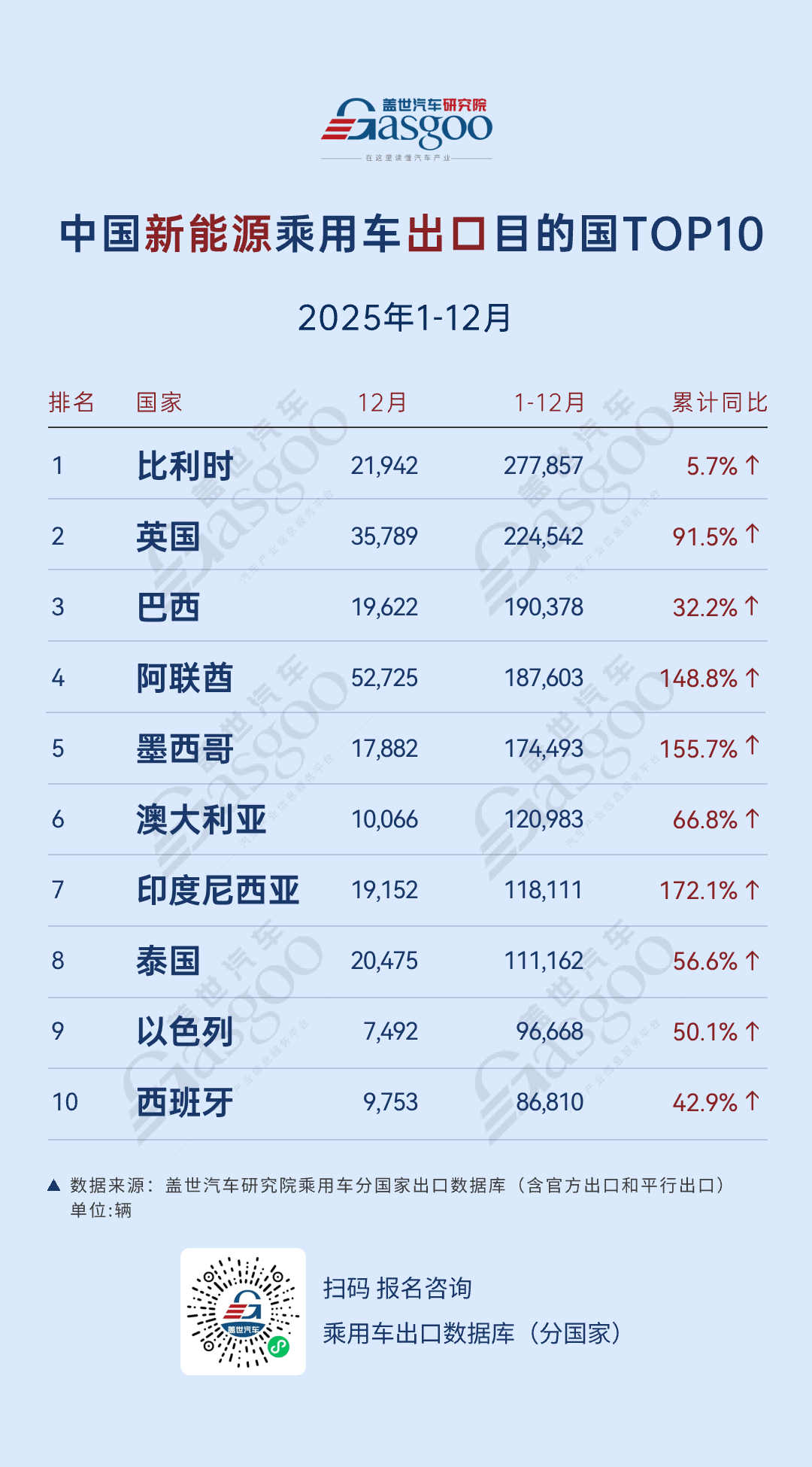 NO.3 巴西,2025年1-12月,向巴西出口新能源乘用车190,378辆,12月单月出口19,622辆,累计同比增长32.2%。