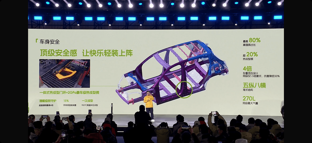 安全,是全新QQ3重塑小车价值的核心。车身采用高强度钢占比72%、热成型钢占比19%的坚固结构,并创新使用了一体式热成型门环和“五纵八横”笼式车身,整车扭转刚度高达27000N·m/deg,侧面抗撞强度是普通车的3-4倍。电池安全方面,“全钢铠甲电池包”采用DP780高强度钢360°全包覆,具备IP68最高防水等级,并通过了针刺不起火等严苛测试。主动安全配置同样齐全,搭载包括540°全景影像、AEB主动刹车、BSD盲区监测在内的L2级智能驾驶辅助系统,构建了从被动到主动的全维安全防护体系。