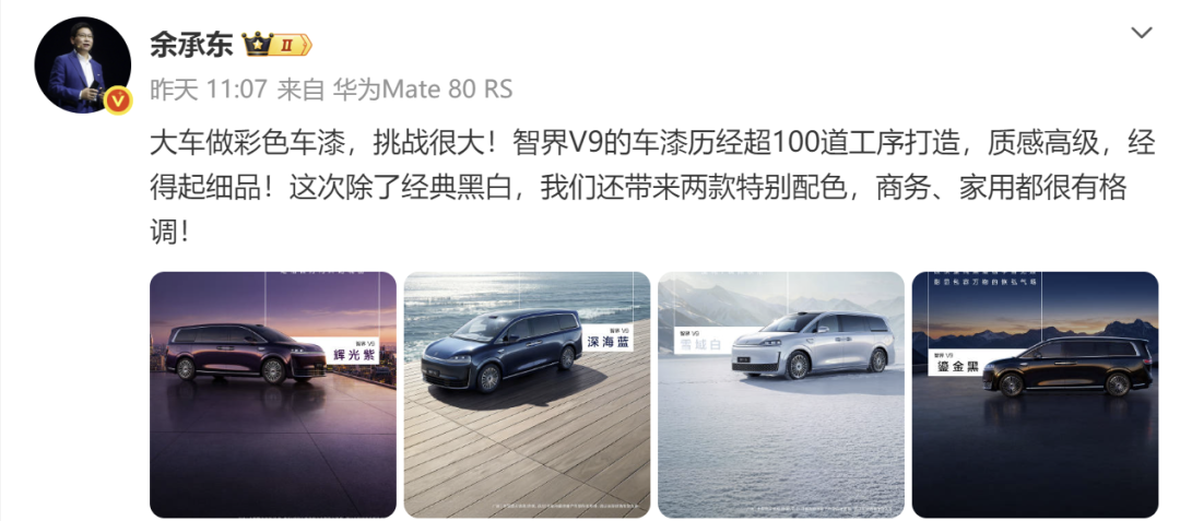 智界V9四款颜色,余承东亲自揭晓,排面拉满;