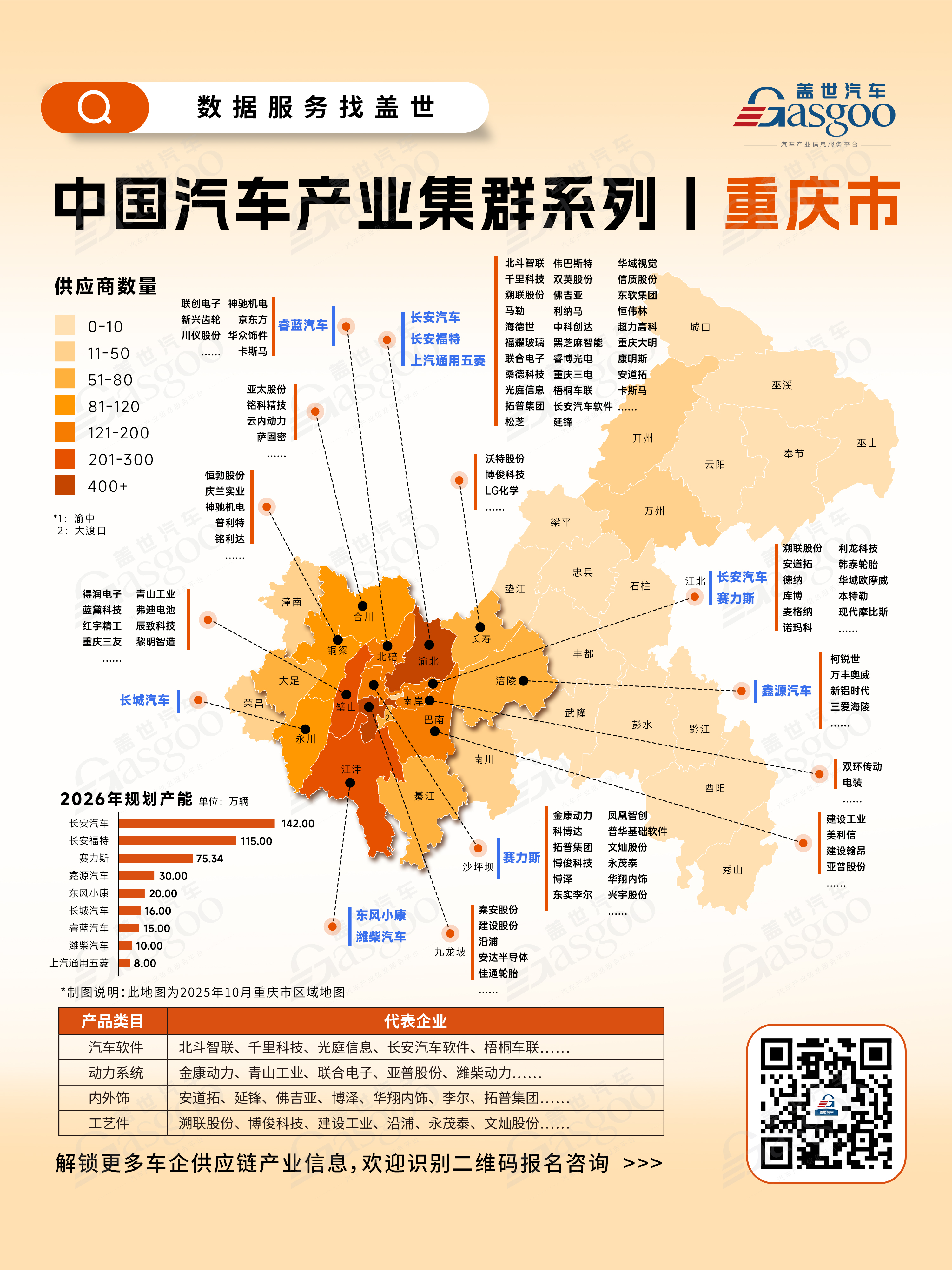 根据盖世全球汽车产业大数据的统计与梳理,重庆市作为中国西部重要的汽车产业集聚地,依托较为成熟的产业基础和完善的供应链体系,形成了“核心带动、区域协同、链条覆盖”的产业格局,在全国汽车产业版图中具有一定影响力。