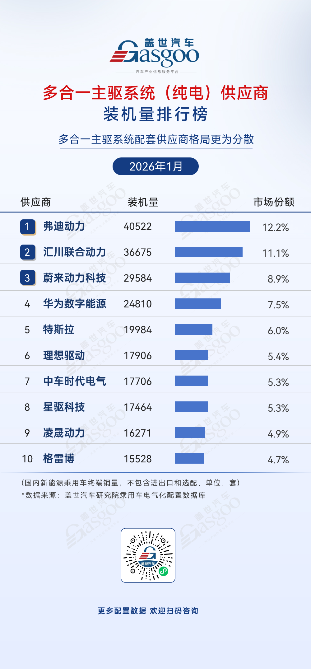 弗迪动力,2026年1月装机量40522套,市场份额12.2%。