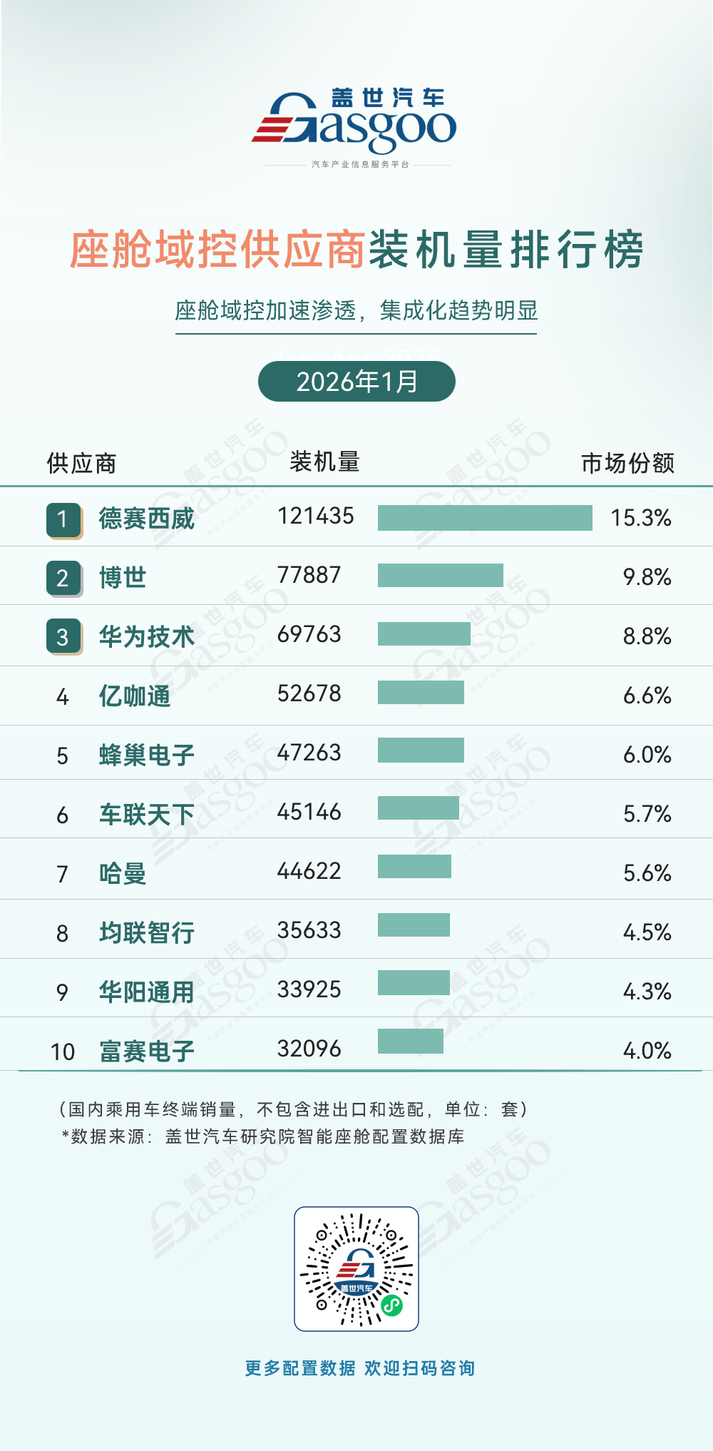 第一位,德赛西威,2026年1月装机量121435套,市场份额15.3%