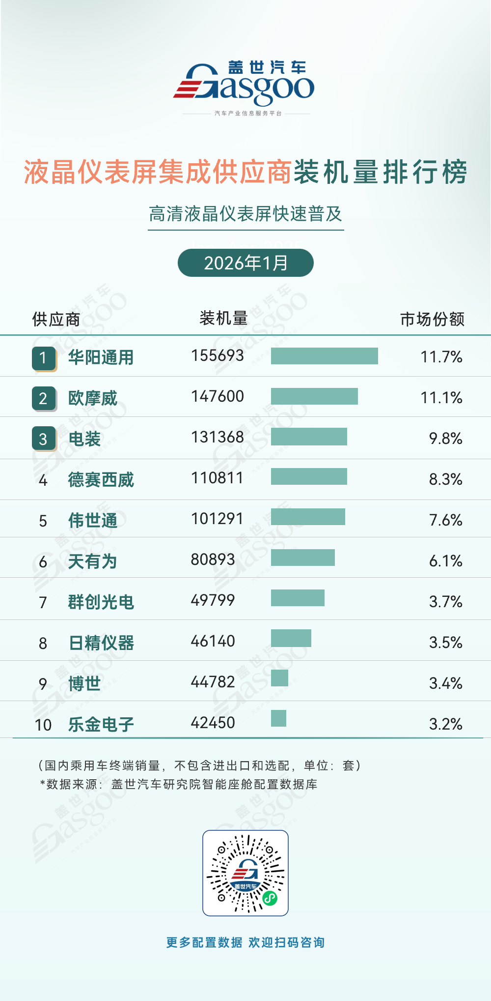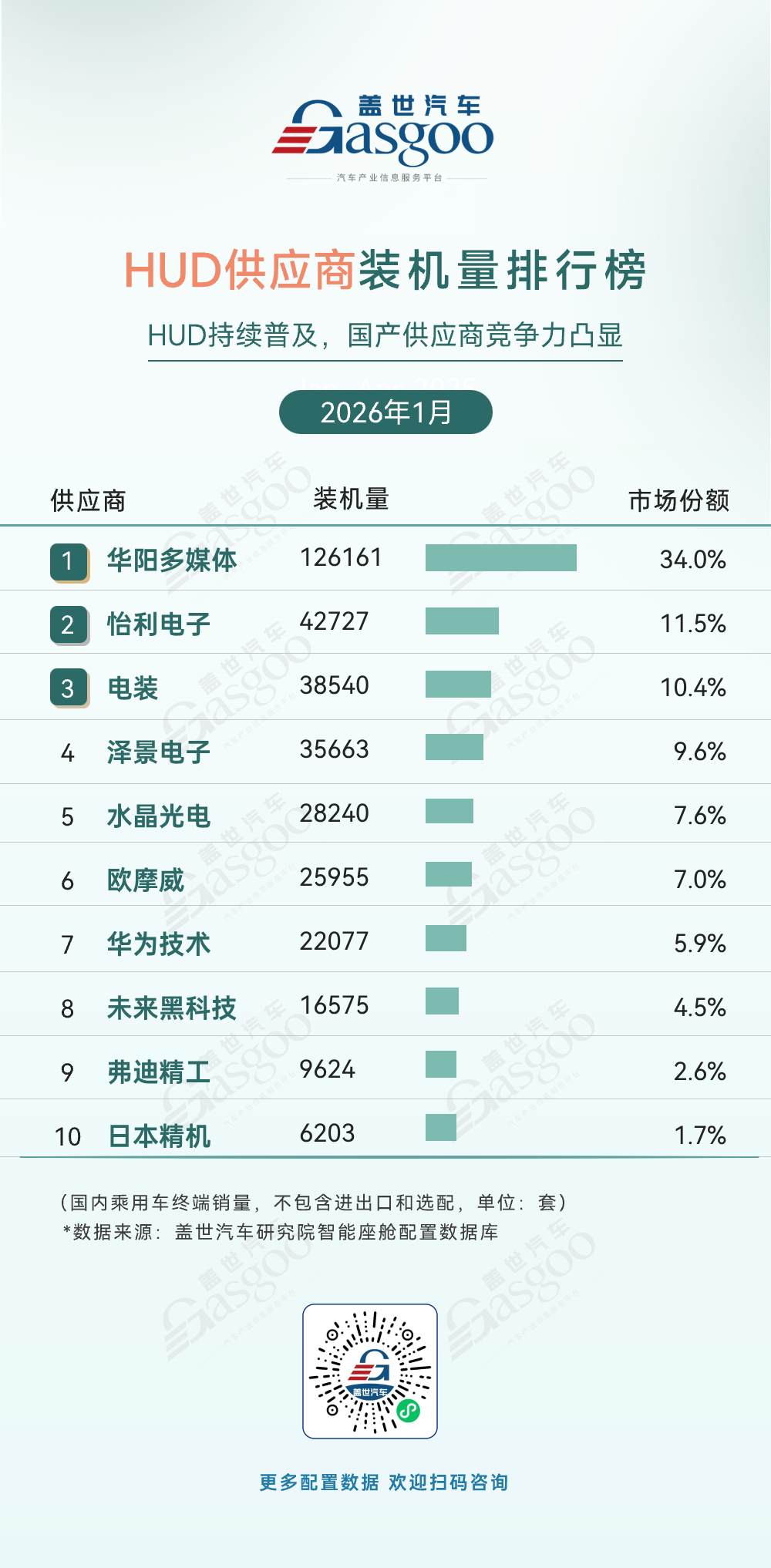 第十位,富赛电子,2026年1月装机量32096套,市场份额4.0%