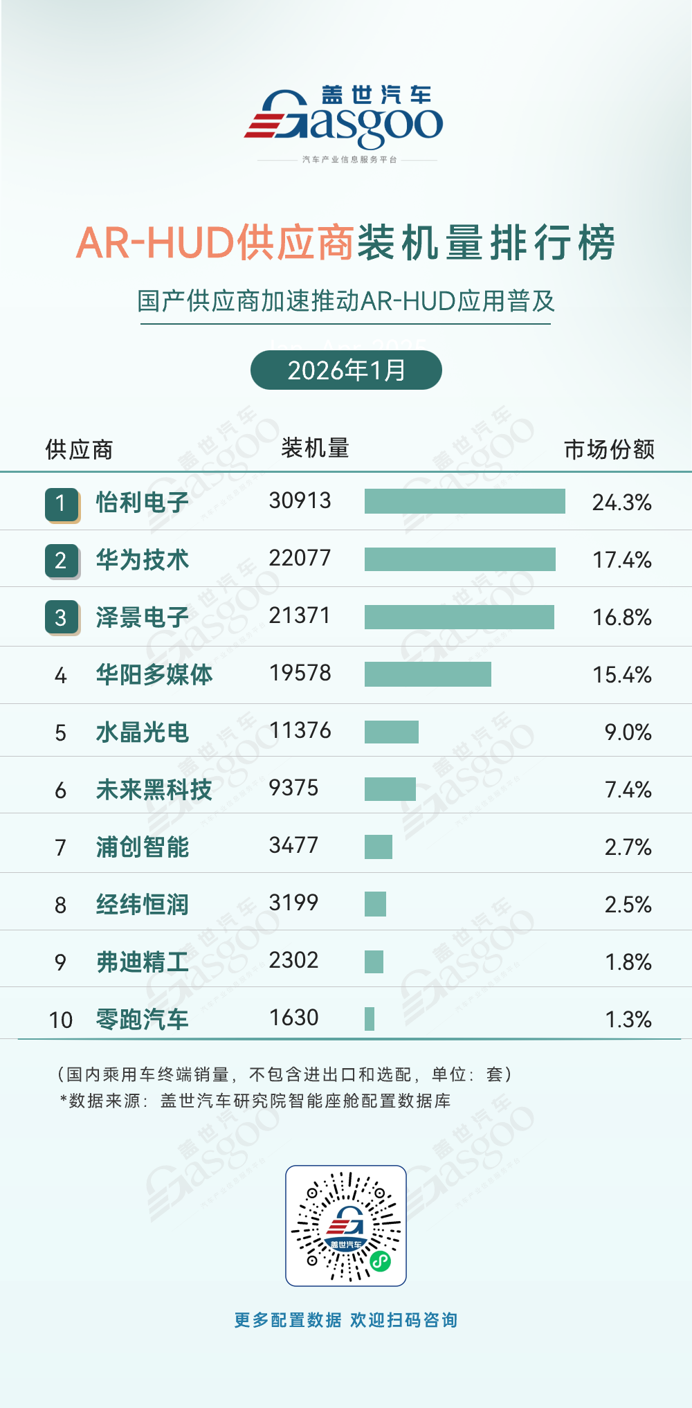 第三位,泽景电子,2026年1月装机量21,371套,市场份额16.8%