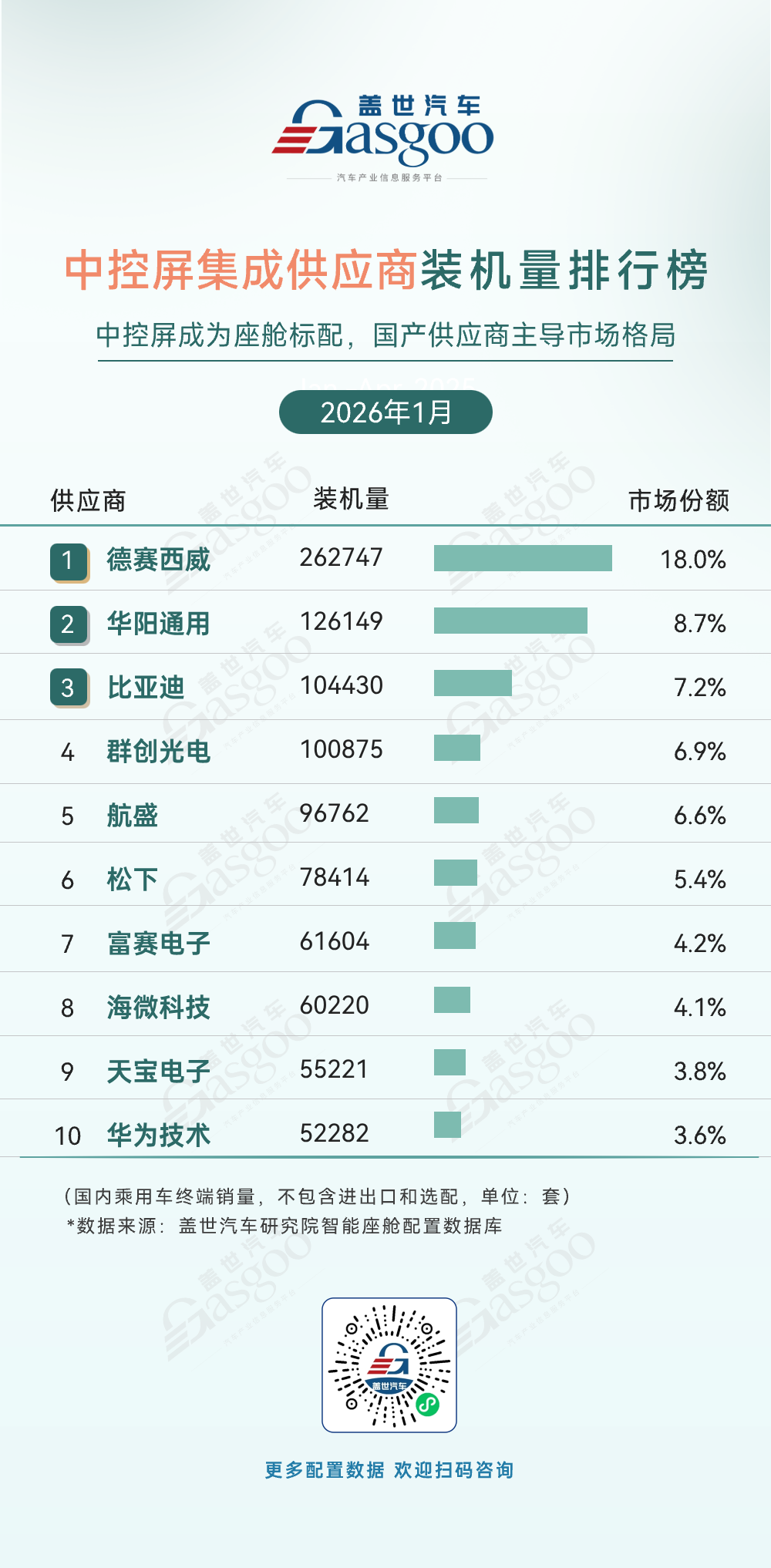 第一位,德赛西威,2026年1月装机量262,747套,市场份额18.0%