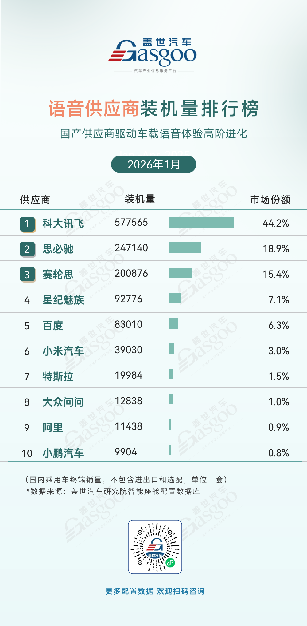 第一位,科大讯飞,2026年1月装机量577,565套,市场份额44.2%