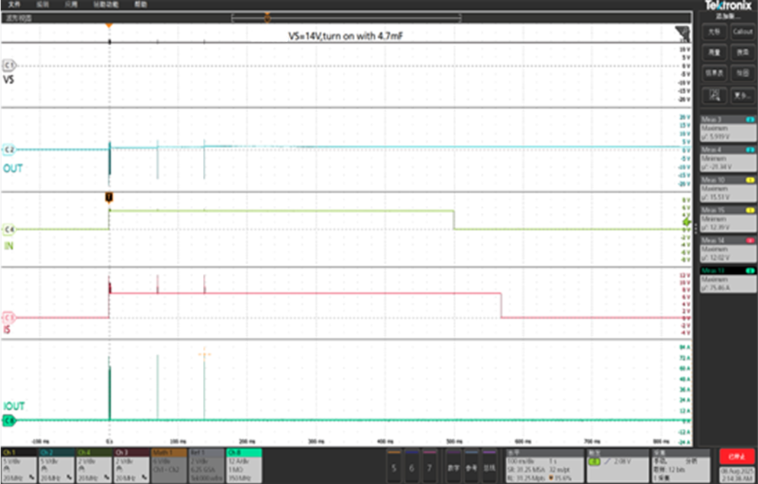 TPW4020DQ特别的故障Retry和Latch保护机制,实现智能功率锁止,使其能够支持更大电容负载的应用,图4所示为TPW4020DQ通过内部限流与温度保护控制的多次Retry过程,实现了输出带4.7mF电容的正常上电。而同样条件下,国外竞品带4.7mF电容的上电波形如图5所示。