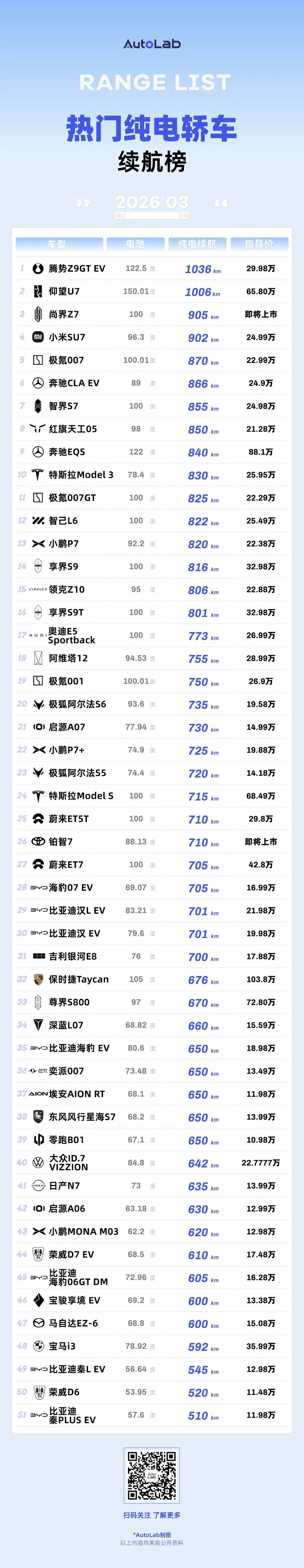 每款车型,都会选取其续航最长的版本,同时尽量覆盖当下的热门车型,以及已经明确将在近期上市的新车。