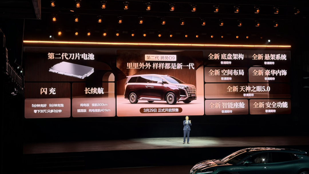 第二代腾势D9全系都用上了比亚迪最新的第二代刀片电池,并具备了闪充能力。