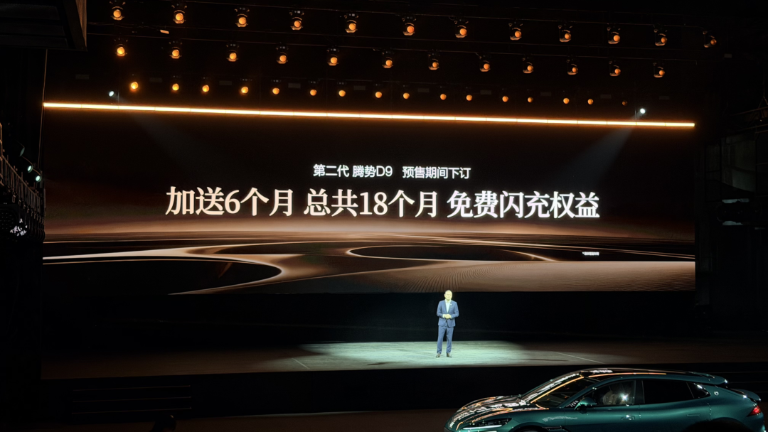 值得一提的是,这次腾势D9还给出了1年的免费闪充权益。如果是在预售期间下定,还会额外多送半年,总计18个月的免费充电。