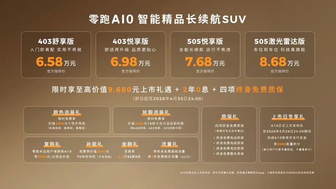 为进一步彰显产品诚意,自上市之日起至2026年4月30日24:00,零跑A10同步推出限时上市权益,覆盖选装、复购、补能、金融、流量、质保等多个维度,限时权益总价值最高可达9680元,为意向用户提供更具性价比的购车选择。