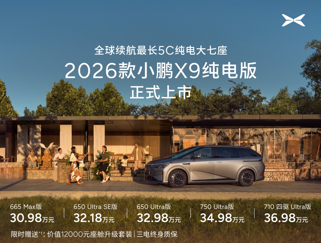 3月2日,2026款小鹏X9纯电版正式上市。新车共推出5款车型,售价区间为30.98万-36.98万元。此外,2026款小鹏X9超级增程版还新增上市了一款1602 Ultra SE车型,售价为32.18万元。作为年度改款,新车在外观细节小幅调整的基础上,核心升级点在于全系标配图灵AI芯片与第二代VLA物理世界大模型,并延续了800V平台与5C超充电池的组合,智驾能力与综合产品力得到全面提升。
