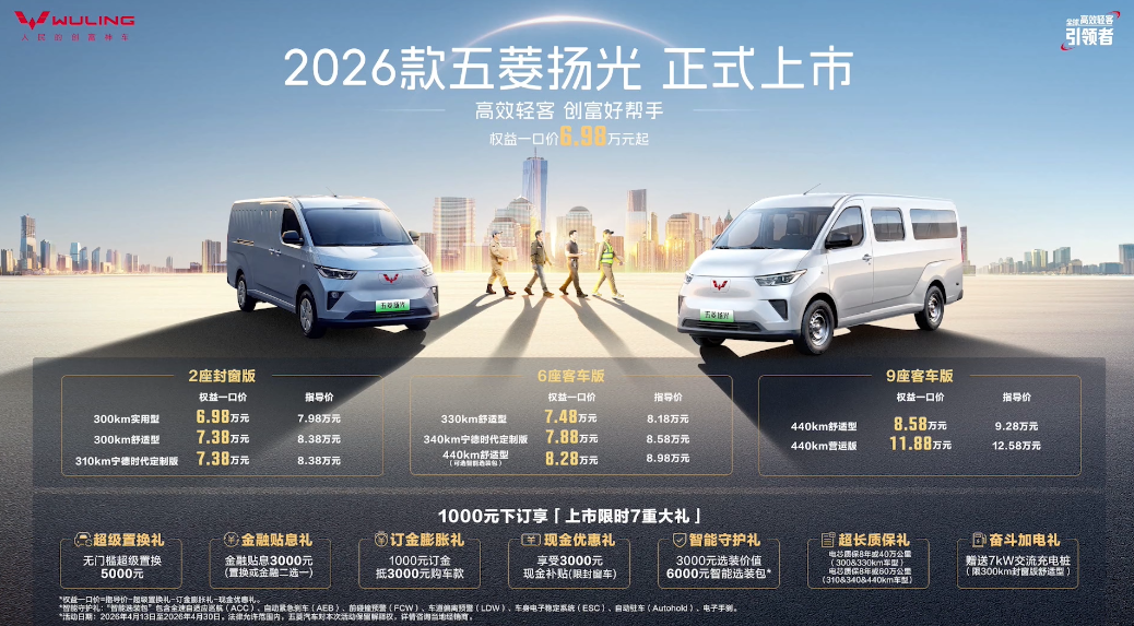 4月13日,2026款五菱扬光通过一场聚焦真实运营场景的创富挑战直播正式上市。新车推出覆盖封窗版、客车版(含营运版)的全场景产品矩阵,提供330km、340km(宁德时代定制版)及440km三种续航选择,官方限时一口价6.98万元起。作为已连续24个月蝉联细分市场销冠的新能源轻客,本次改款精准回应城配行业从“规模扩张”向“效率驱动”转型的核心需求,在“不加价”的前提下,实现了续航、动力、智能、空间四大维度的全面“加码”。新车产品矩阵全面,满足不同创富场景:封窗版专注物流货运,客车版(含营运版)兼顾载客需求。即日起,用户可享受多重上市礼遇:无门槛超级置换5000元或金融贴息3000元(二选一);支付1000元订金可抵扣3000元购车款;部分车型可享至高3000元现金补贴;提供至高8年或60万公里的超长电芯质保;指定车型赠送7kW交流充电桩。上市期间,还可限时享受智能选装包的升级权益。