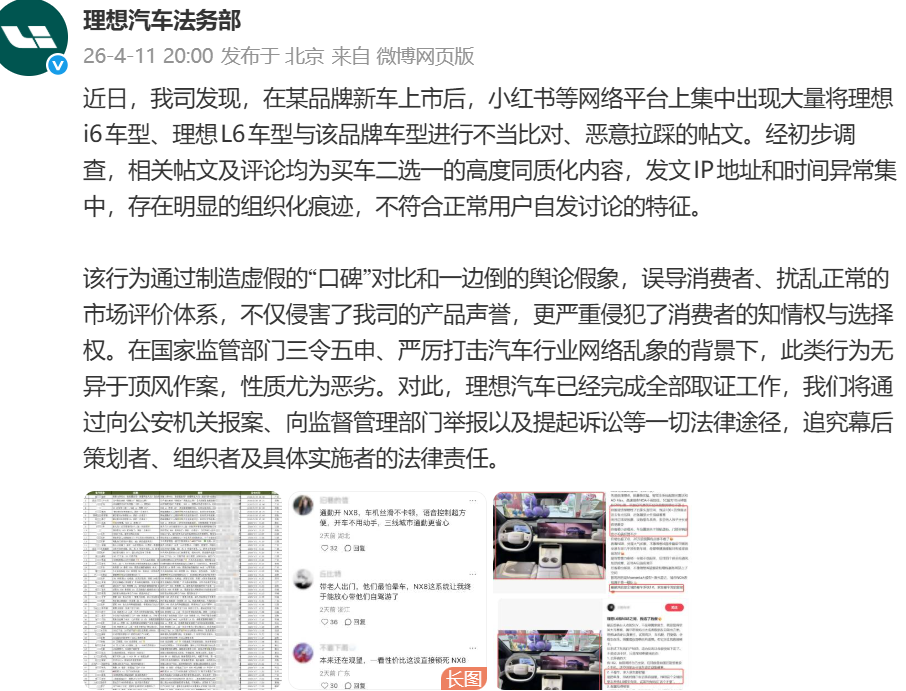 随后,李想又发布朋友圈,配图显示李想质疑某日系合资车企利用“黑公关”手段,用自家新车拉踩理想i6。事件持续发酵,连理想汽车法务部也下场发声。