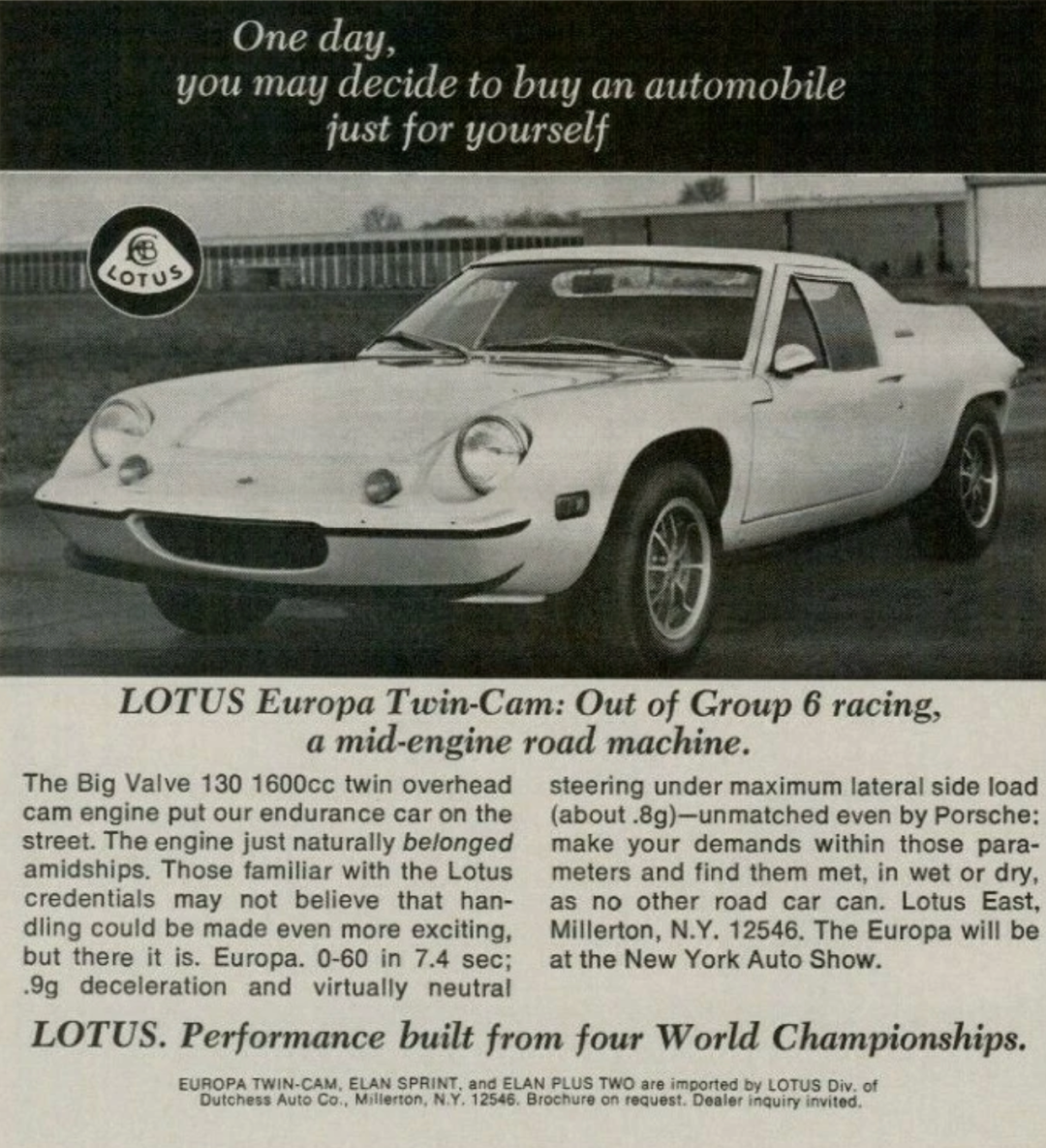 在一张1972年的莲花欧罗巴双凸轮轴版广告上,莲花跑车还特意用加粗黑体字在底部关键位置写上了: