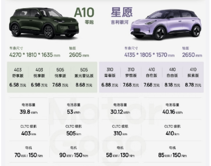 零跑A10顶配版售价8.68万元,直接卡在10万以内。同等预算下,买吉利星愿只能选到中配基础款,而比亚迪元UP的长续航、高配置版本早已突破10万门槛。更直观的对比是:同样带L2级辅助驾驶,比亚迪元UP的智驾版(401km续航)售价9.98万元,吉利星愿STAR限定版(410km续航)售价9.88万元。而A10的505km激光雷达版,续航更长、智驾还支持城市NOA能力更强,价格反而更低。
