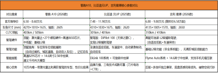 这款车到底凭什么火?我们不妨从续航、智驾、价格三个维度,把它和10万级纯电市场的两个主力对手——吉利星愿(6.88万-9.88万)、比亚迪元UP(7.48万-11.98万)——掰开来比一比。