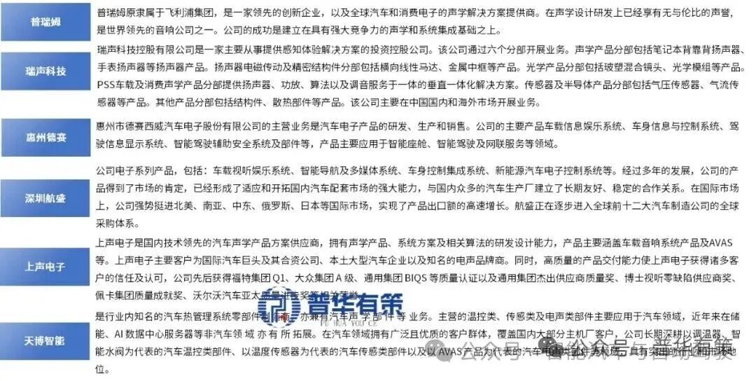 核心优势:上声电子是国内技术领先的汽车声学产品方案供应商,是A股上市公司(688533)。公司拥有声学产品、系统方案及相关算法的完整研发设计能力,产品涵盖车载扬声器系统、车载功放及AVAS,能够提供全面的产品解决方案。上声电子在2025年上半年发布了AI全景声音响系统技术,配备53扬声器、4000W大功率功放和720°全景声场重构技术,属业界首创。公司较早实现了车载扬声器的国产化配套,具备较强的国际市场竞争能力。