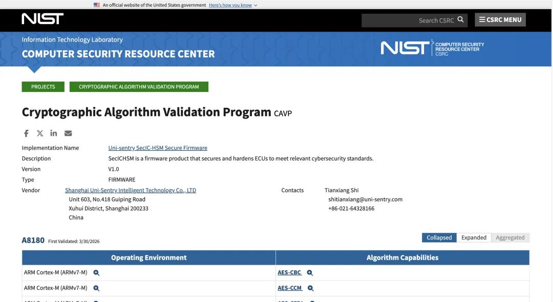 上海伊世智能科技有限公司的后量子密码算法及经典密码算法,已正式通过美国国家标准与技术研究院(NIST)密码算法验证计划(CAVP)认证。该认证确认伊世智能的密码实现符合NIST FIPS标准,为公司服务全球客户、参与国际市场竞争提供了权威背书。