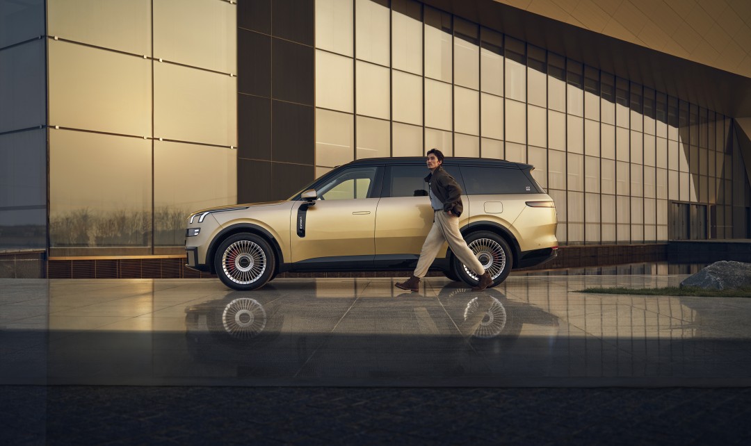 车身侧面,新车以黄金比例勾勒出舒展轮廓,超短前悬与流畅水平腰线消解了大型SUV的体量感,在沉稳中透出灵动姿态。Flush Door工艺带来镜面般的平整质感,搭配电动吸合门,出入更为优雅从容。21英寸光翼或光曜轮毂可选,与专属日冕金车色相互映衬,金属光泽醇厚富有层次,完美契合高端商务与轻奢出行场景。