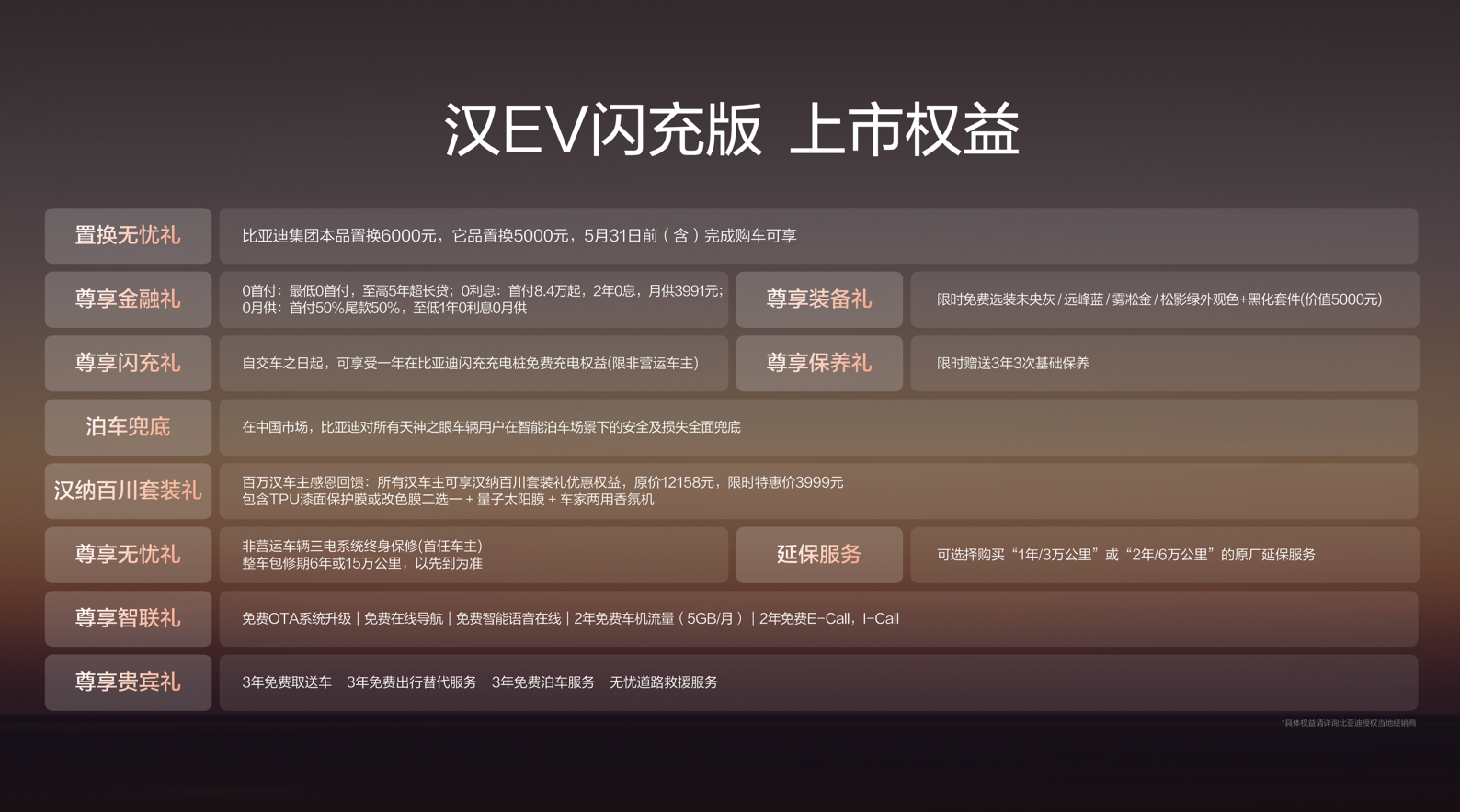 购车权益方面,比亚迪提供了包含置换补贴、1年免费闪充权益、多种金融方案、基础保养及取送车服务在内的多项礼遇。针对个性化需求,还推出了限时特惠的“汉纳百川”进阶生活套装。比亚迪王朝网络遍布全国超320个城市的1800余家服务门店,将为用户提供配套服务。